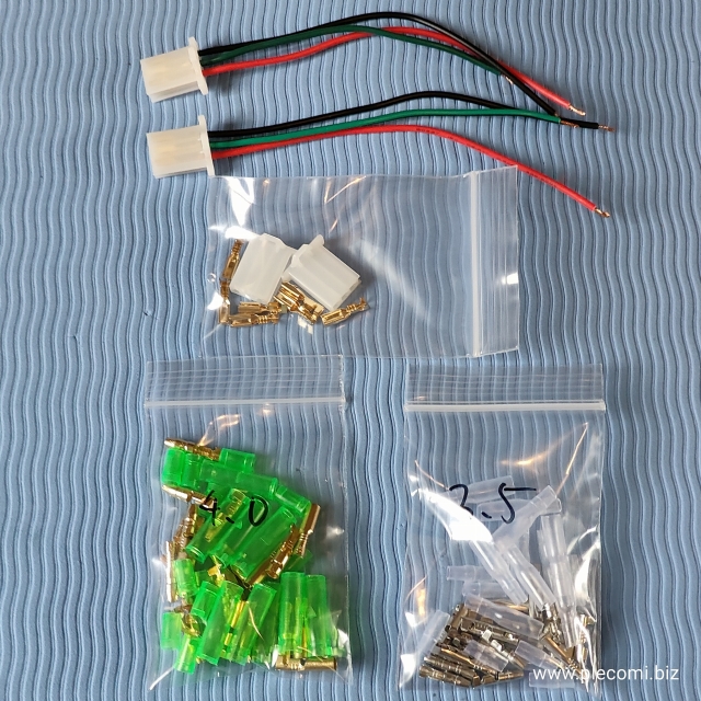 ヘッドライトとテールライトの接続キットです。3pメスカプラの線付きのものを2セットと 3pメスカプラ2セットと 4.0mmのオスメスギボシを10セット 3.5mmのオスメスギボシを10セット 利用するライトアッシに合わせて利用してください。3.5mmのギボシはポジションランプなどの電力消費が少ない部分用で、ヘッドライト配線をギボシ接続するときは4.0mmを利用してください。なるべく電工ペンチを利用してかしめてください。50Wを超える電力消費が多いヘッドライトを利用するときはそれに合わせてリード線を用意してください。希望があれば 当店にてヘッドライトなどに配線加工できます。(要見積 送料別1個1000円~)